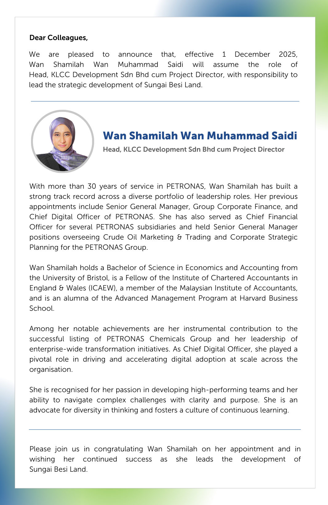 Senior Leadership Appointment – Wan Shamilah